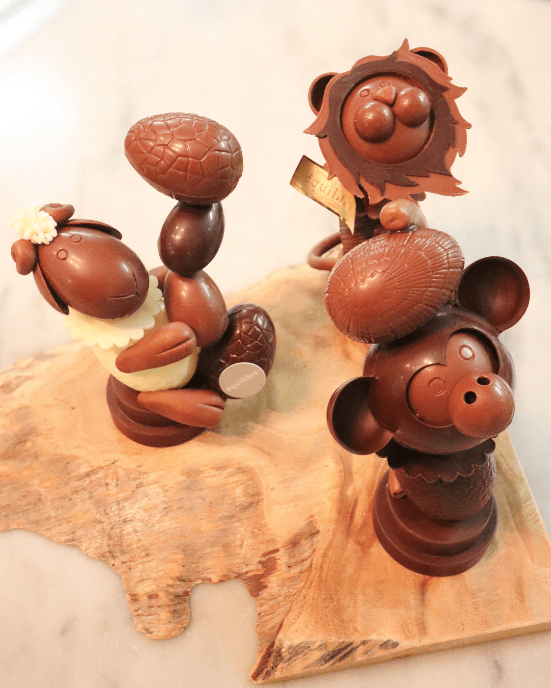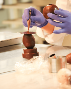 イースターを目前に控えた今回の講習会。会場には高橋シェフの技術を一目見ようと多くの受講者が詰めかけ、シェフの手元を逃すまいとカメラを向ける熱い視線が注がれていました。披露されたのは、繊細な造形が目を引くイースターエッグ2品(ウフ・ニュアージュ、ウフ・ドゥー・サレ)と、愛らしい動物たちの中にアーモンドチョコを忍ばせた「ショコラ・アニモー」。
